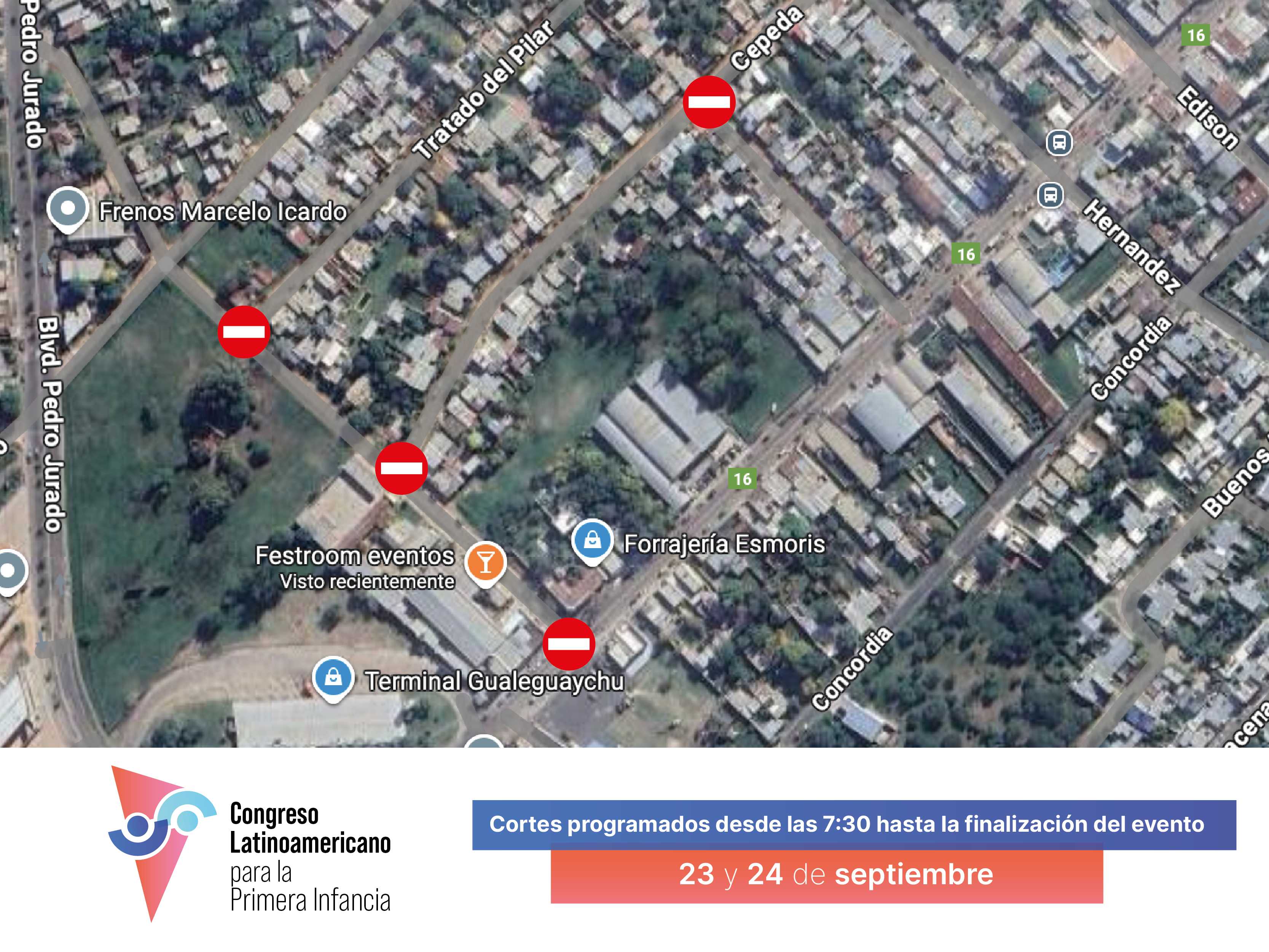 El Gobierno de Gualeguaychú informa que con motivo de la realización del Congreso Latinoamericano para la Primera Infancia, se implementarán cortes y desvíos de tránsito en calles aledañas al Salón de Eventos Festroom (Bozzano 672), donde se desarrollará el encuentro.