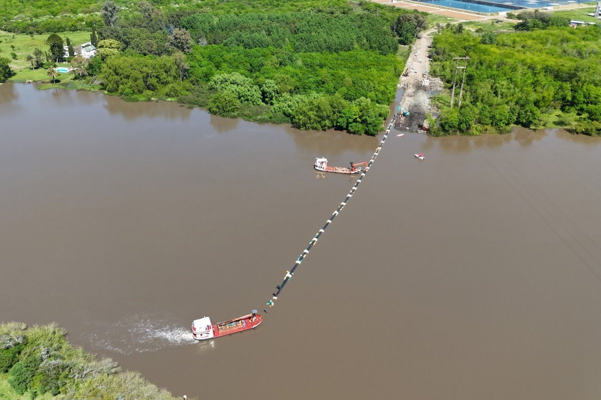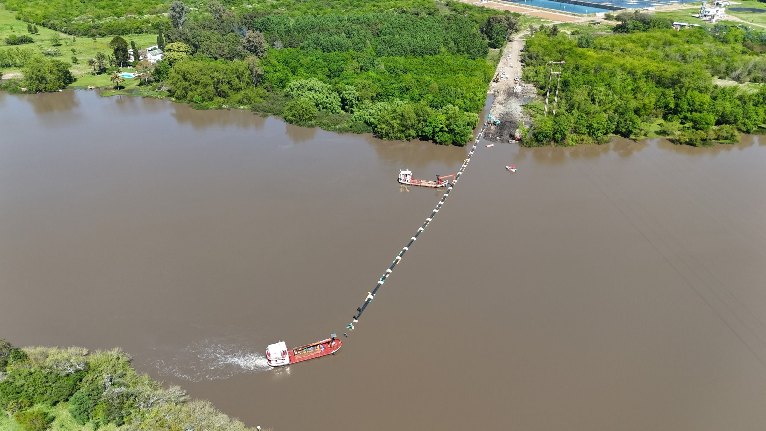 En el marco del proyecto de ampliación y mejora de la planta de tratamiento de efluentes cloacales de Gualeguaychú, se llevó a cabo el hundimiento del emisario, una cañería de gran diámetro que conduce las aguas tratadas hacia el río, donde son liberadas de forma regulada y segura.