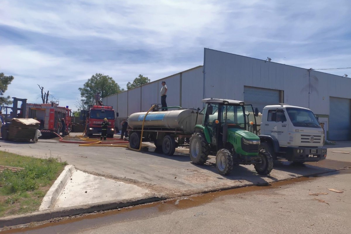 El operativo contó con el apoyo logístico de dos cisternas a tractor y un camión regador municipal, que aportaron asistencia hídrica a las tareas de extinción. Además, un tractor con pala frontal colaboró en la remoción de materiales, junto a dos autoelevadores, uno perteneciente a la empresa afectada y otro a una firma vecina, que también sumaron esfuerzos al operativo.