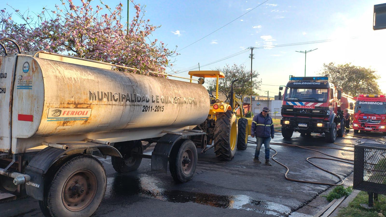 Durante el operativo trabajaron las unidades 29, 31, 36, 37 y 38 de Bomberos Voluntarios, además de maquinaria y cisternas municipales que fueron incorporadas para asistir en las tareas de recarga, enfriamiento y remoción de escombros. En este sentido, participaron la Dirección de Obras y Servicios Públicos —con una cargadora frontal y un tractor con pala— y la Dirección de Higiene Urbana —con cisternas de agua—, que reforzaron el trabajo de las cuadrillas en el terreno.