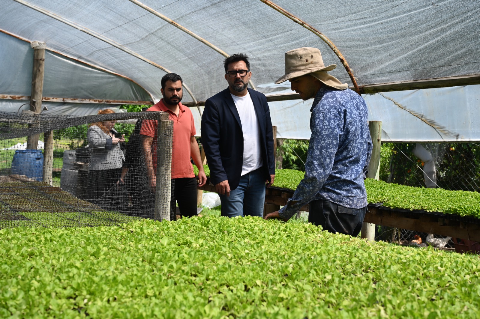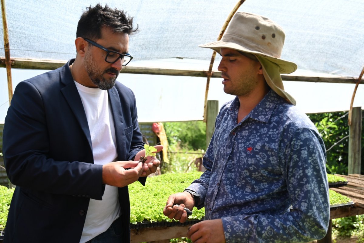 Durante la visita, las autoridades conocieron de primera mano la organización interna de la cooperativa y su dinámica de trabajo, que mantiene en producción cerca de dos hectáreas destinadas principalmente al cultivo de verduras de hoja durante todo el año. Suma cultivos estacionales como albahaca, radicheta, tomate y zapallito, lo que amplía la oferta disponible según las condiciones climáticas y la demanda del mercado.