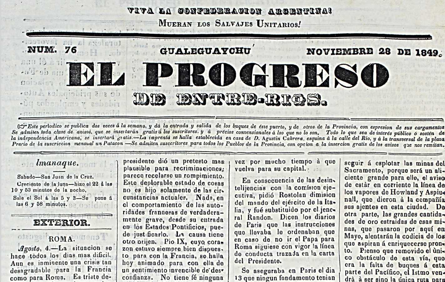 Hace exactamente 176 años, la entonces Villa San José de Gualeguaychú nombraba por primera vez sus calles, y el diario El Progreso lo comunicaba de la siguiente manera: