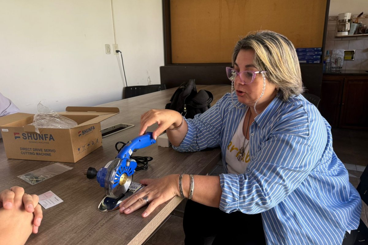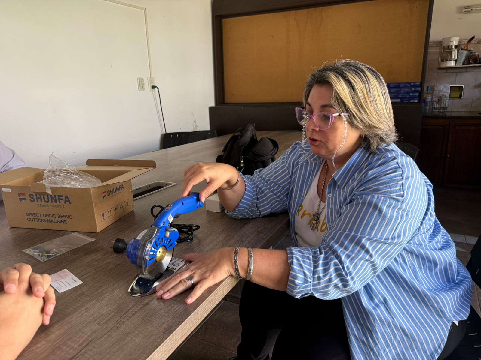 El beneficio otorgado consistió en la adquisición de una máquina de cortar tela con cuchilla circular de 4 pulgadas, equipada con motor servo direct drive, luz led incorporada y 4 velocidades de trabajo. Se trata de una herramienta liviana y de alta precisión, con base deslizante y una altura de corte de hasta 27 milímetros, diseñada para optimizar procesos productivos en trabajos textiles.