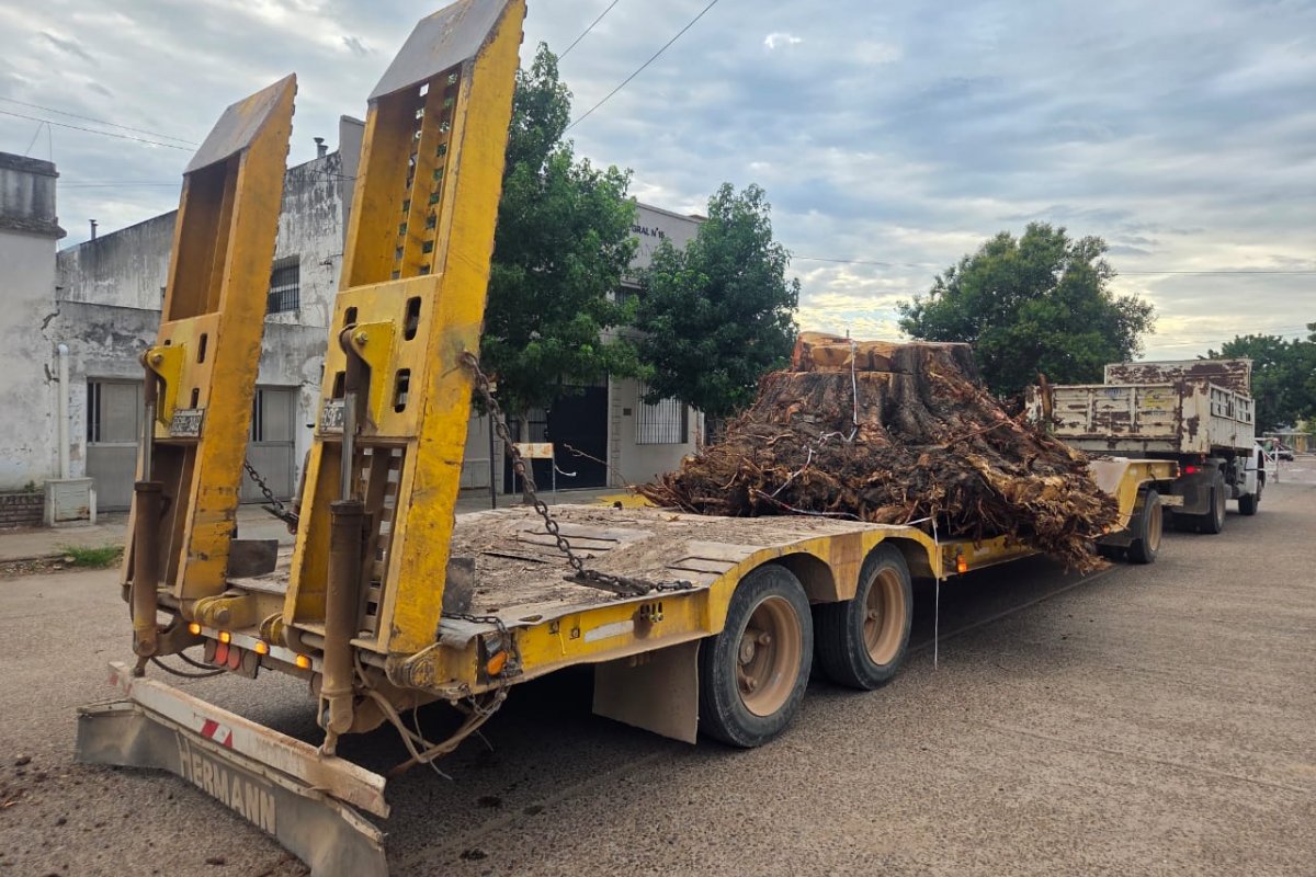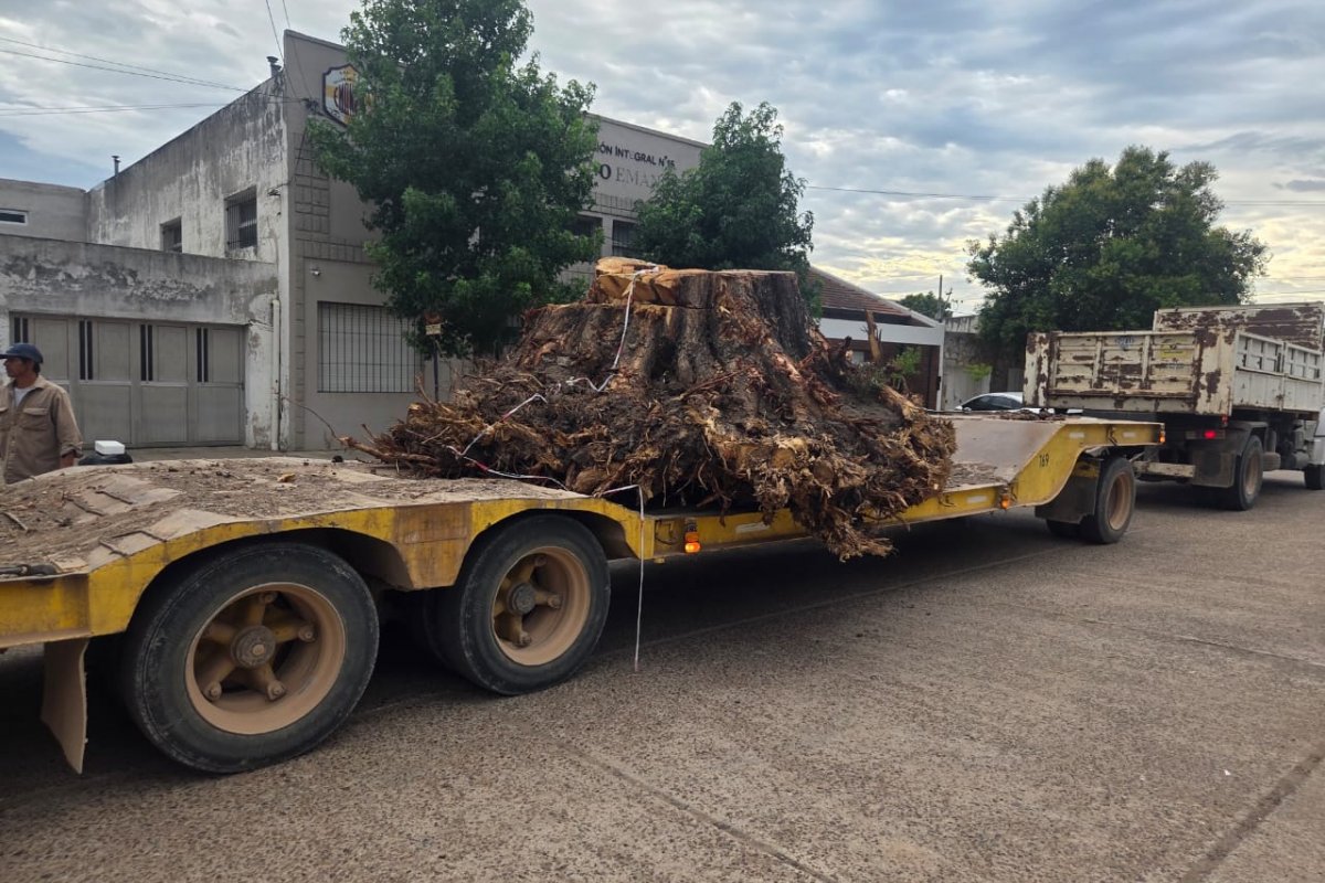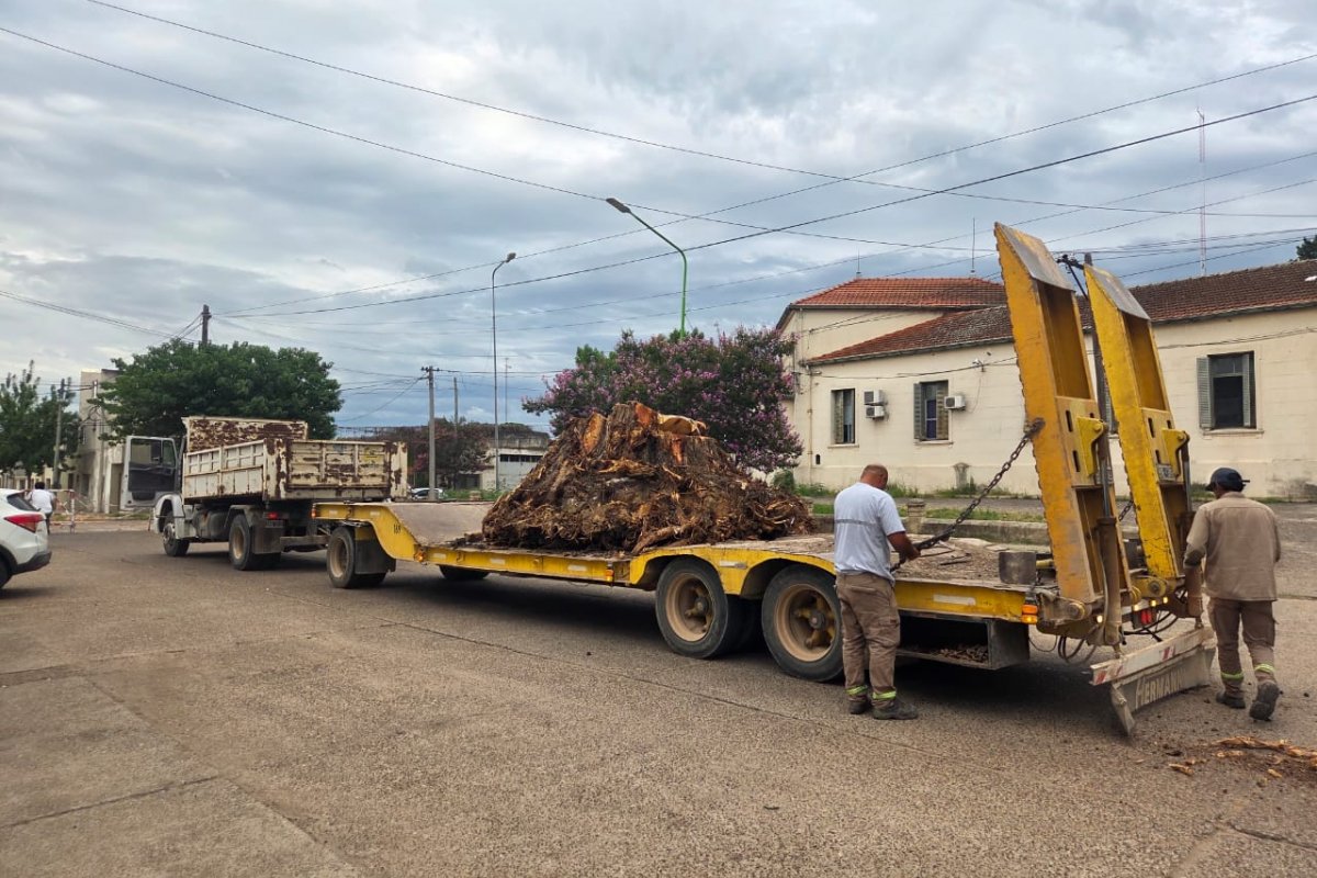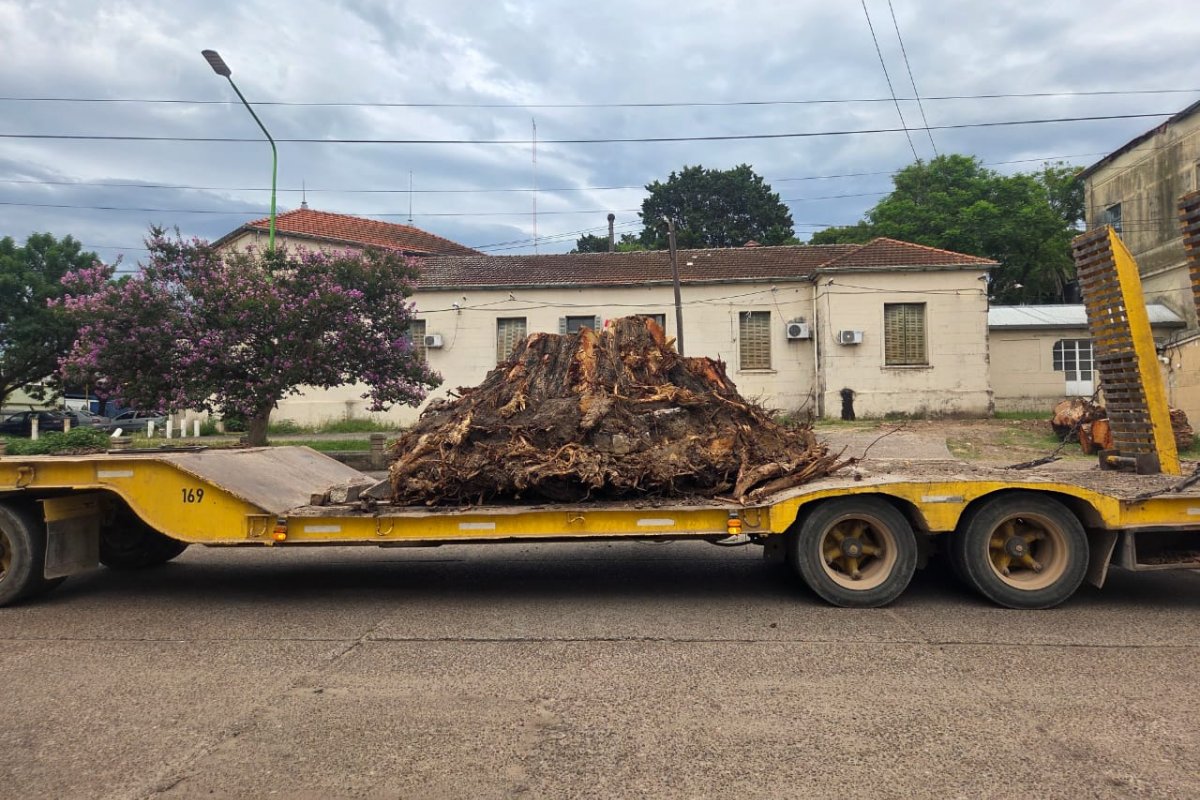 Tras décadas de presencia, el ejemplar mostró señales claras de agotamiento. El trabajo evitó peligros y despejó un acceso clave del sistema sanitario local. La parte última del tronco fue retirada por Espacios Verdes.