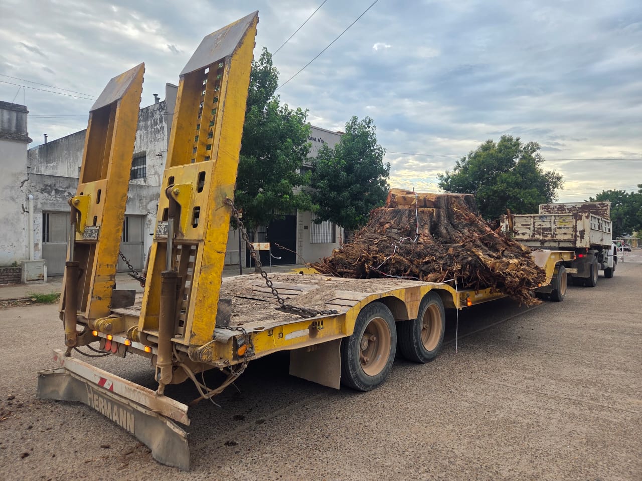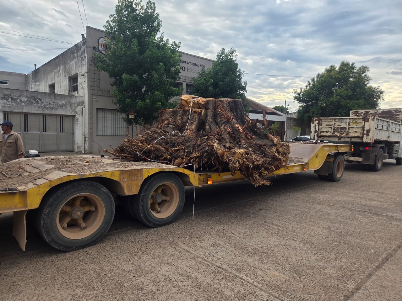 Los trabajos en este caso avanzaron con el retiro y la carga los últimos restos vegetales, los cuales estaban compuestos por raíces, troncos y material orgánico -con un peso de entre 7 y 8 toneladas- que fueron extraídos y depositados en un carretón para efectuar el traslado final.