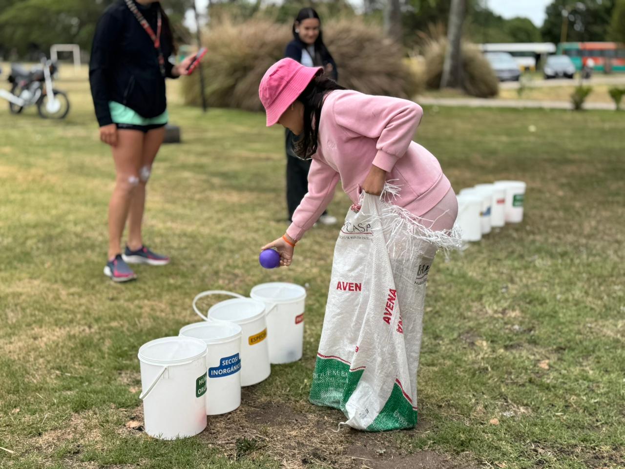 Luego de la instancia teórica, se desarrolló una propuesta lúdica pensada para reafirmar los saberes adquiridos. La actividad consistió en un juego tipo carrera de embolsados, en el que los chicos debían trasladar pelotitas que simulaban residuos y clasificarlas correctamente en los distintos tachos, según el tipo de desecho correspondiente.