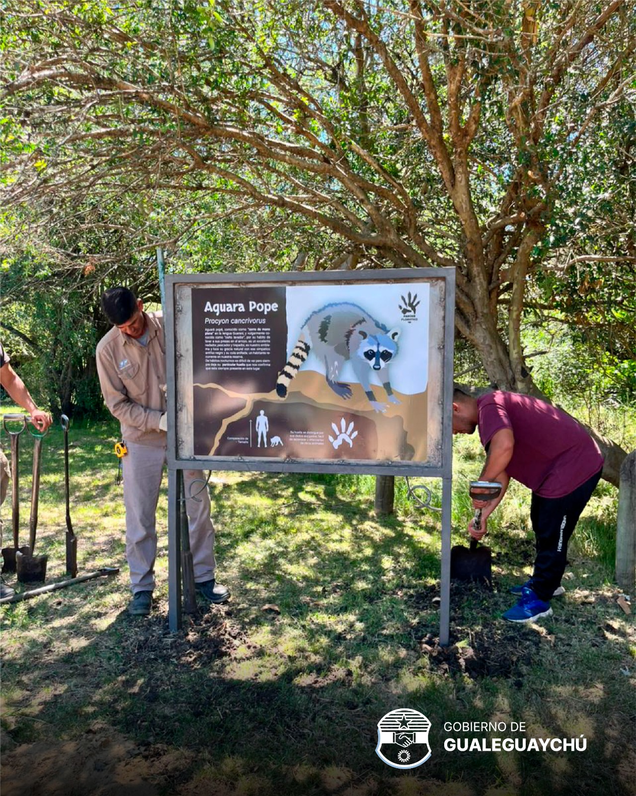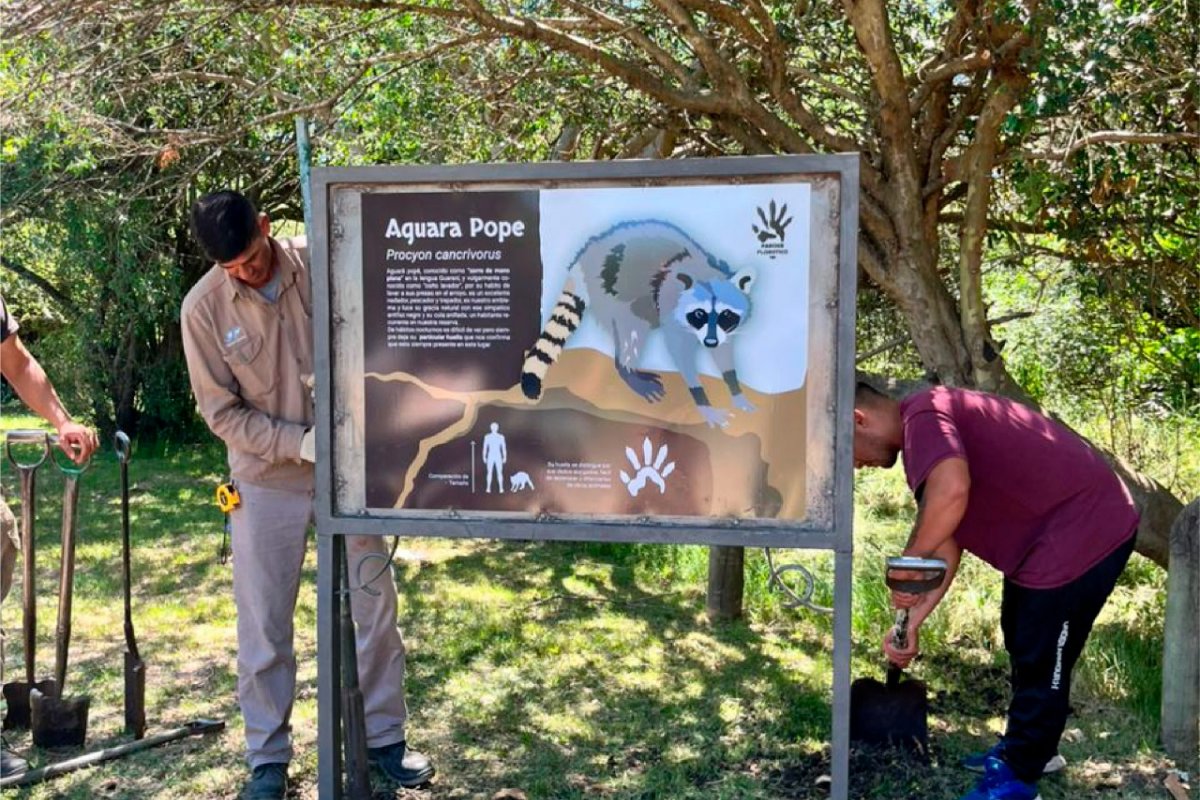 De manera destacada, la cartelería incorpora un panel exclusivo dedicado al aguará pope, especie nativa y representativa del logo del Parque Florístico, reforzando su valor como símbolo de la fauna local y la necesidad de su protección.