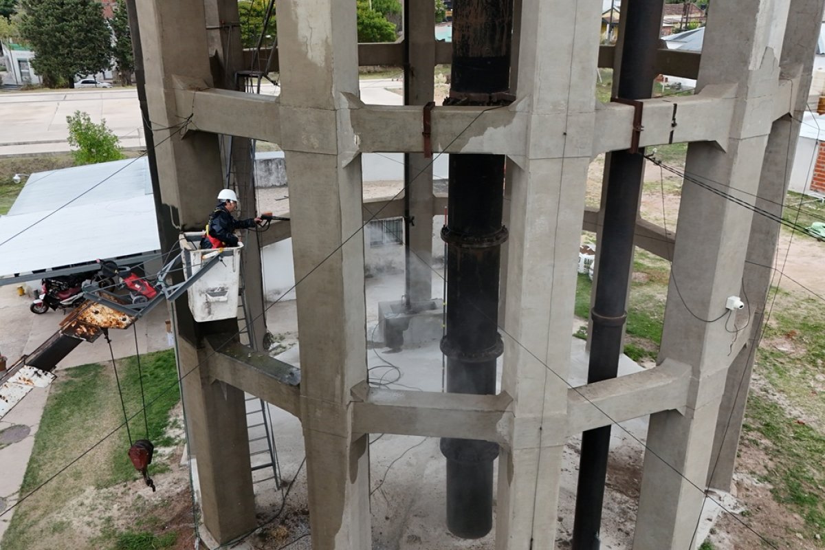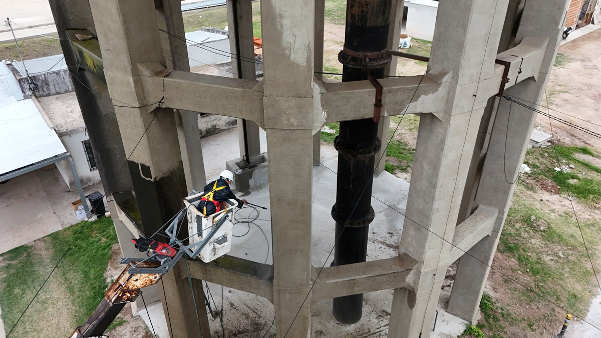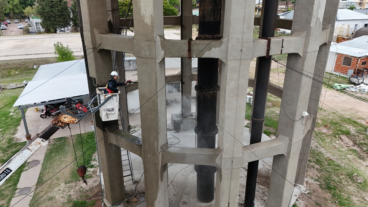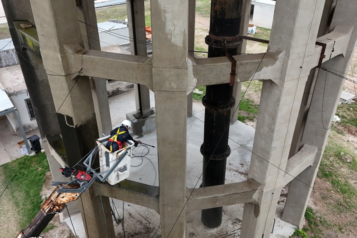 El tanque principal de Obras Sanitarias, emplazado en la planta potabilizadora de Gualeguaychú, atraviesa una intervención destinada a recuperar condiciones estructurales y sanitarias básicas de un elemento que ya es un sello distintivo de la Dirección encargada de la distribución de agua potable en la ciudad.