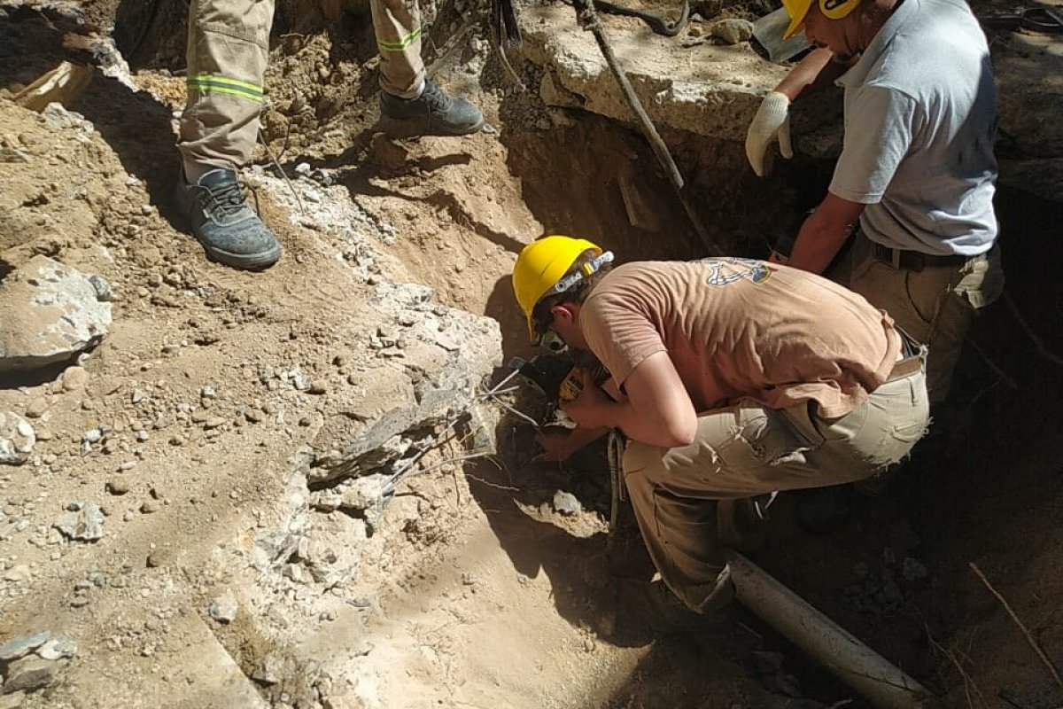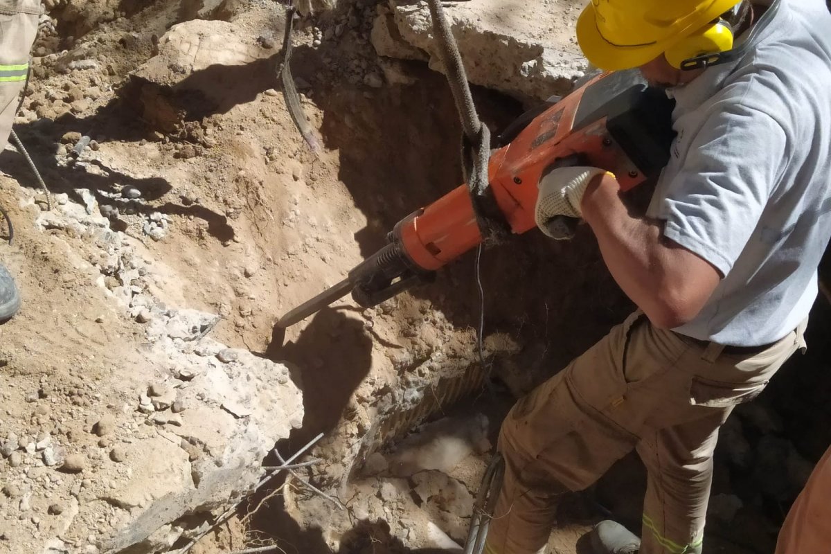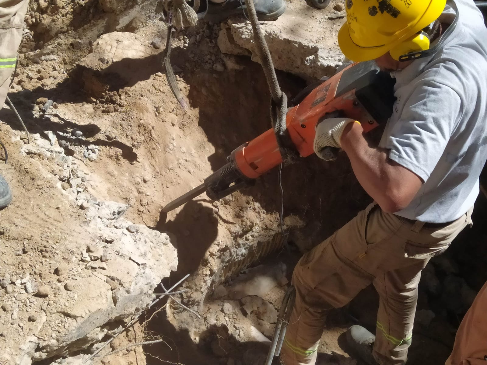 La intervención demandó la utilización de equipamiento específico, que incluyó cortadoras de pavimento con disco diamantado para apertura de calzada, martillos neumáticos para la remoción de material consolidado, retroexcavadoras para la extracción de suelo y herramientas manuales para tareas de precisión en sectores de difícil acceso.
