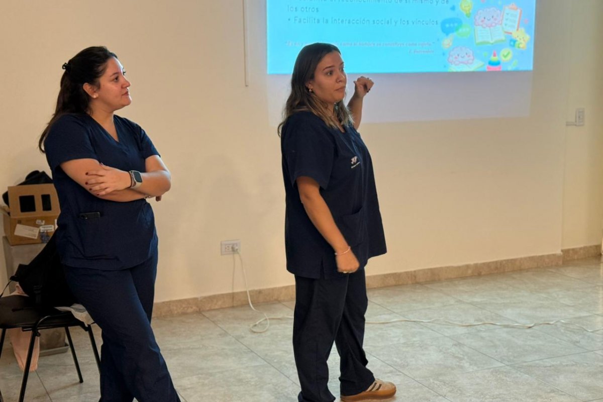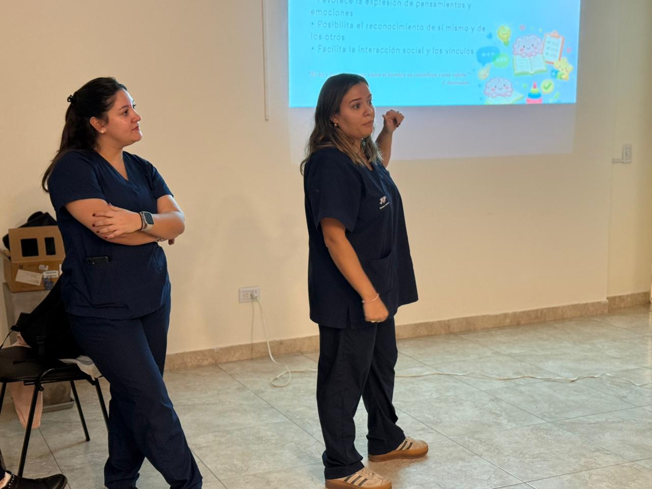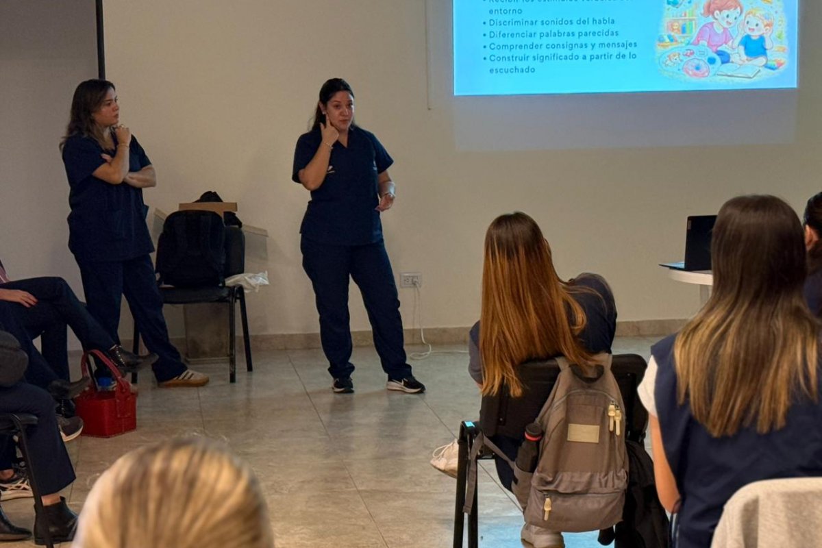 La propuesta se desarrolló durante la jornada de ayer y estuvo a cargo del equipo de fonoaudiólogas de los EMPI, integrado por las licenciadas Victoria Nieto y Paula Brun. Durante el encuentro se compartieron contenidos teóricos y herramientas prácticas orientadas a enriquecer el trabajo cotidiano en las salas, promoviendo intervenciones acordes a las necesidades de la primera infancia.